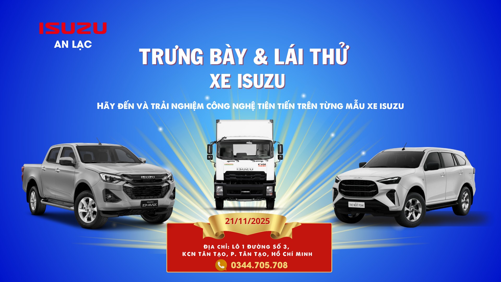 Để Quý khách hàng có cơ hội trải nghiệm thực tế và tìm hiểu chi tiết các dòng xe hiện có, ISUZU AN LẠC xin thông báo sự kiện Trưng bày & Lái thử xe vào ngày 21/11/2025 tại Lô 01, Đường số 3, KCN Tân Tạo, P. Tân Tạo, TP.HCM.
