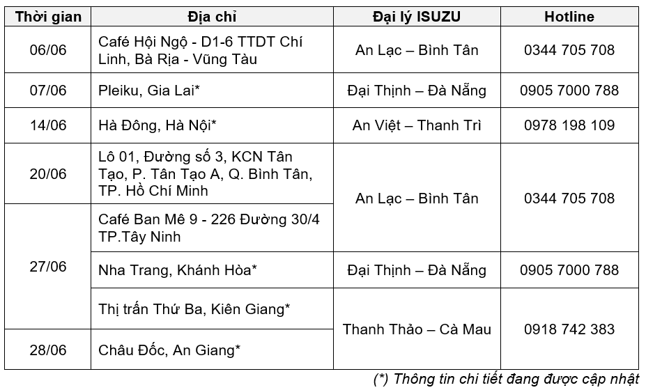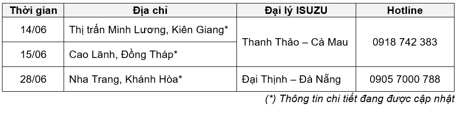 Hãy lưu lại lịch sự kiện Trưng bày & Lái thử xe tháng 6 – 2025 của ISUZU dưới đây và liên hệ với hotline của Đại lý để biết thêm thông tin chi tiết!